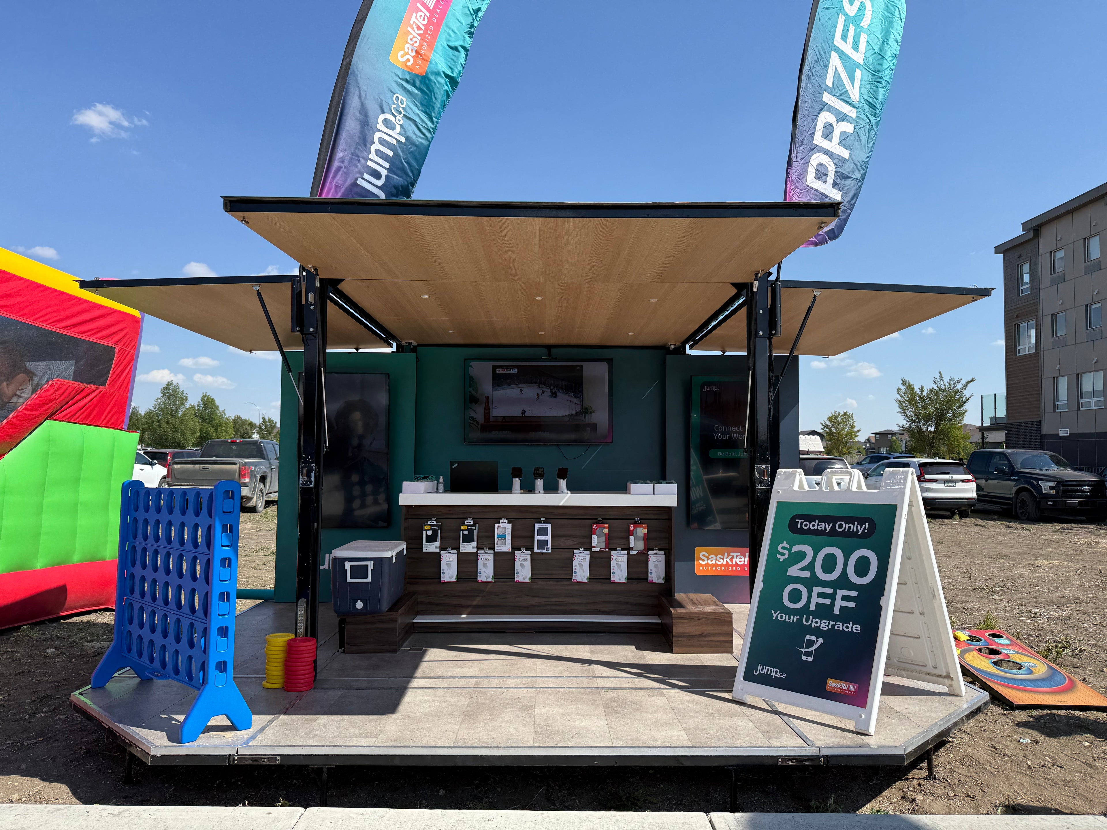 The Jump.ca Mobile Experience is a 16' wide x12' deep x 8' tall event trailer containing SaskTel wireless, interNET and maxTV experiences.