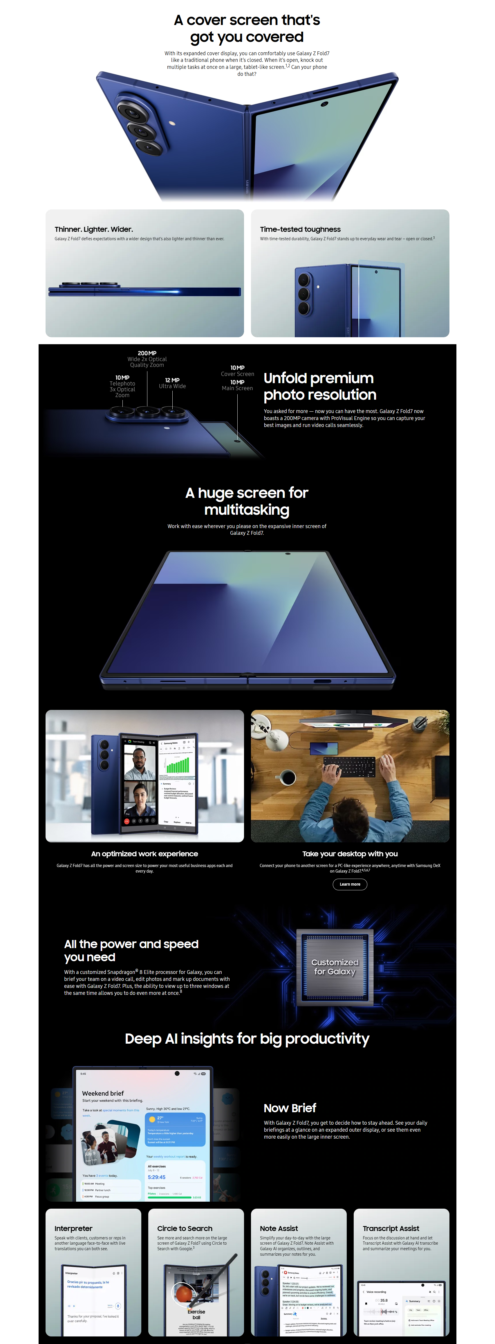Whether folded or unfolded, Galaxy Z Fold7 exceeds your expectations of a smartphone. With a newly expanded 21:9 cover screen and even sleeker form, it's easier to hold and type on than ever so you can get things done comfortably. And, with the main unfolded screen clocking in 8" across, it's the most expansive screen on Galaxy smartphones.