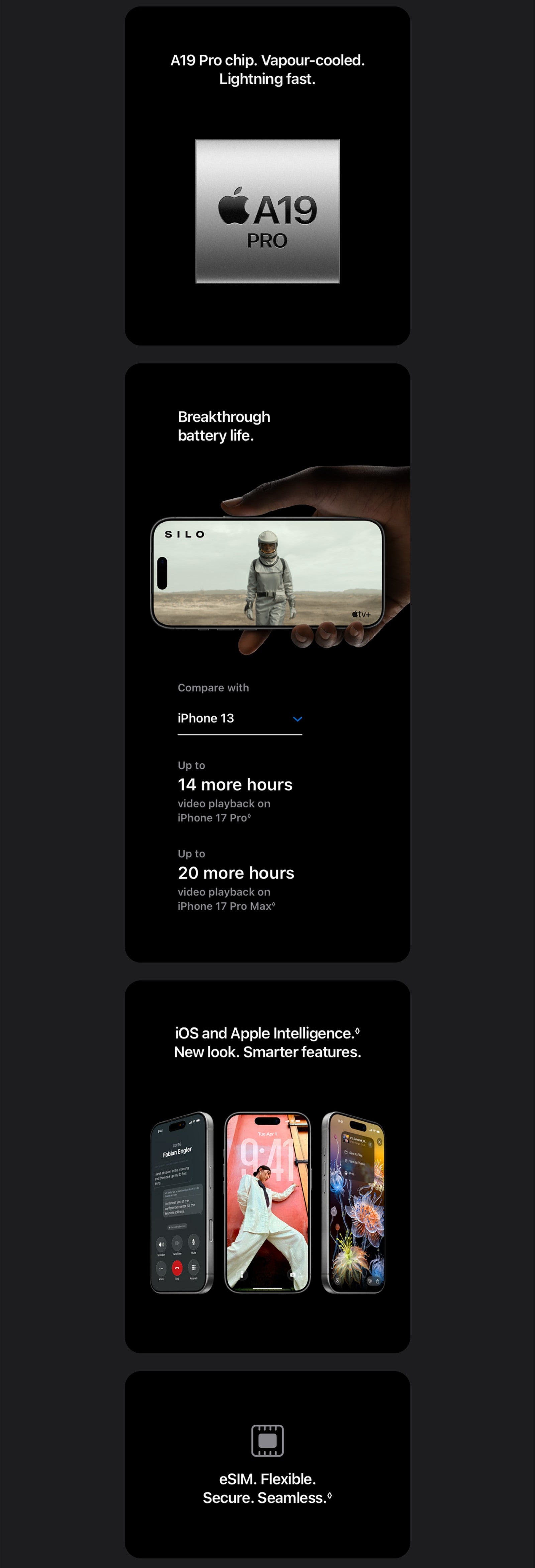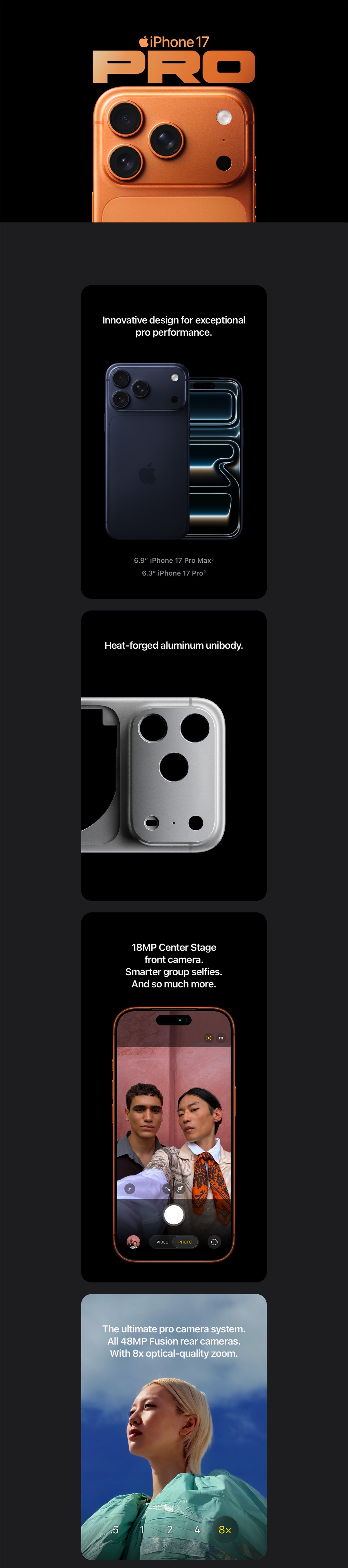 iPhone 17 Pro Max. Exceptional performance. New Center Stage front camera. Ultimate pro camera system. Breakthrough battery life. A19 Pro chip.