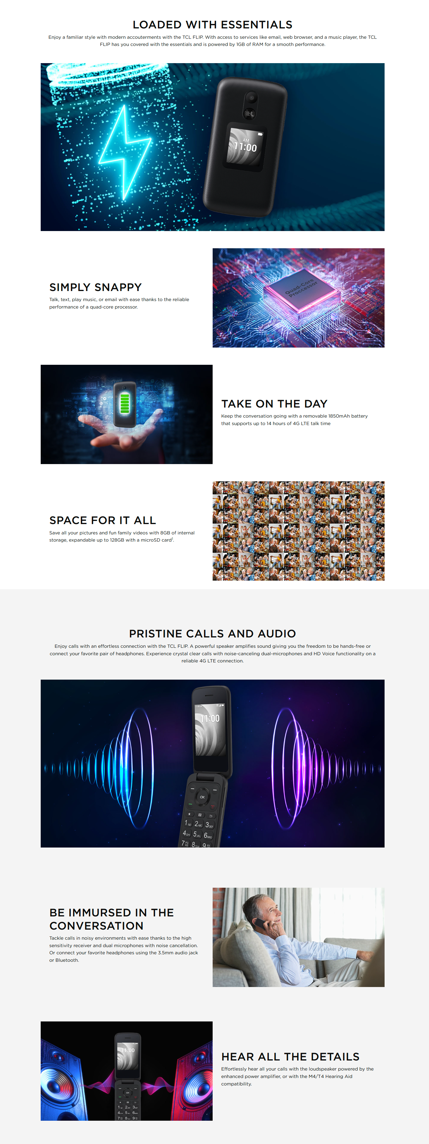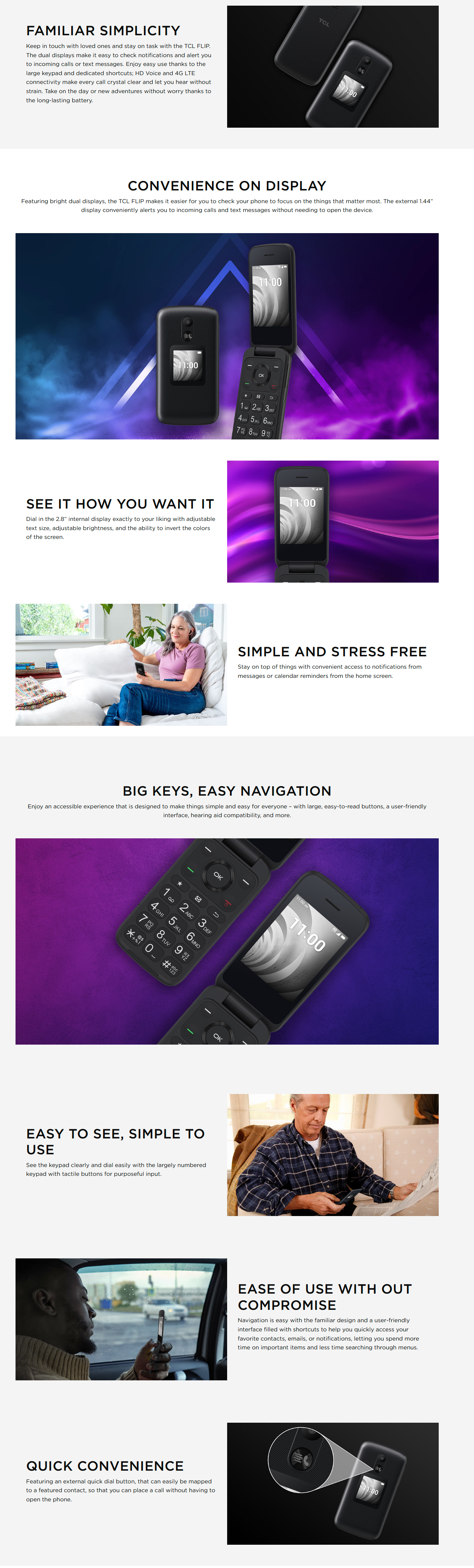 The TCL FLIP is a user-friendly mobile device with dual displays and features a large keypad with dedicated shortcuts, HD Voice, and 4G LTE connectivity for clear calls. It also offers hearing aid compatibility and a user-friendly interface for a simple and efficient mobile experience. Order today at Jump.ca!